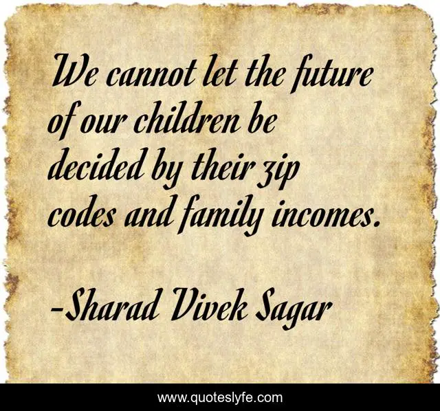 This page presents the quote "We cannot let the future of our children be decided by their zip codes and family incomes.". Author of this quote is Sharad Vivek Sagar. This quote is about dexterity, zipcode, opportunities, educational-opportunities, platforms, future, sharad-sagar, income, sharad-sagar-official,.