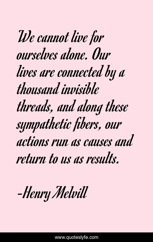 This page presents the quote "We cannot live for ourselves alone. Our lives are connected by a thousand invisible threads, and along these sympathetic fibers, our actions run as causes and return to us as results.". Author of this quote is Henry Melvill. This quote is about life, fiber, generosity, connection, results, cause-and-effect, selflessness, sympathy, live,.