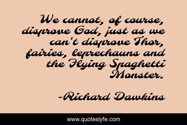 This page presents the quote "We cannot, of course, disprove God, just as we can't disprove Thor, fairies, leprechauns and the Flying Spaghetti Monster.". Author of this quote is Richard Dawkins. This quote is about flying, monster, just,.