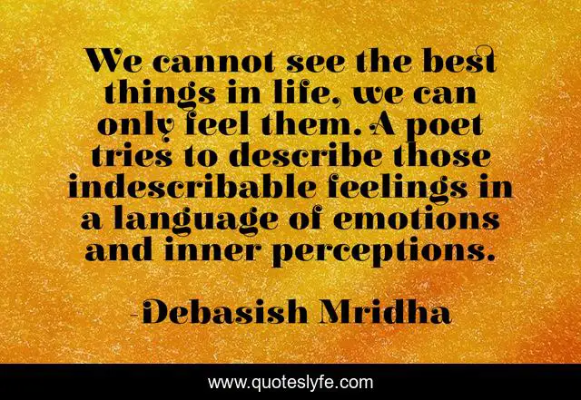 This page presents the quote "We cannot see the best things in life, we can only feel them. A poet tries to describe those indescribable feelings in a language of emotions and inner perceptions.". Author of this quote is Debasish Mridha. This quote is about what-is-poetry, quotes, what-is-a-poet, philosophy, debasish-mridha, best-things-in-life, debasish-mridha-md, inspirational, enthusiasm,.