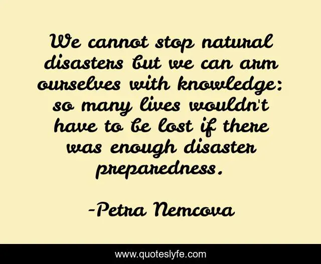 This page presents the quote "We cannot stop natural disasters but we can arm ourselves with knowledge: so many lives wouldn't have to be lost if there was enough disaster preparedness.". Author of this quote is Petra Nemcova. This quote is about natural disasters, lost,.