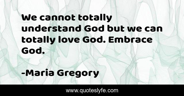 This page presents the quote "We cannot totally understand God but we can totally love God. Embrace God.". Author of this quote is Maria Gregory. This quote is about spiritual-insights, christian, wisdom,.