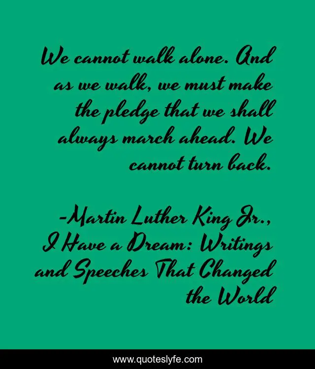 "Martin Luther King Jr., I Have a Dream: Writings and Speeches That Changed the World Quotes." Quoteslyfe.com, 2025. Fri. 05 Dec. 2025. <https://www.quoteslyfe.com/quote/We-cannot-walk-alone-And-as-we-36215>.