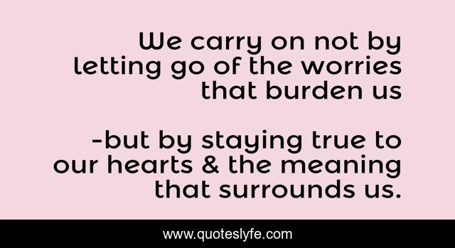 This page presents the quote "We carry on not by letting go of the worries that burden us". Author of this quote is but by staying true to our hearts & the meaning that surrounds us.. .