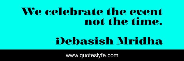 This page presents the quote "We celebrate the event not the time.". Author of this quote is Debasish Mridha. This quote is about celebrate-the-event, mridha, philosophy, quotes, inspirational, time, enthusiasm, debasish-mridha-m-d, celebrate,.