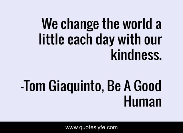 This page presents the quote "We change the world a little each day with our kindness.". Author of this quote is Tom Giaquinto, Be A Good Human. This quote is about happy, kind, help, positive, niceness, confidence, helping-others, kindness, positivity-happiness,.