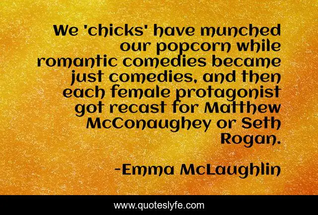 This page presents the quote "We 'chicks' have munched our popcorn while romantic comedies became just comedies, and then each female protagonist got recast for Matthew McConaughey or Seth Rogan.". Author of this quote is Emma McLaughlin. This quote is about popcorn, just, female,.