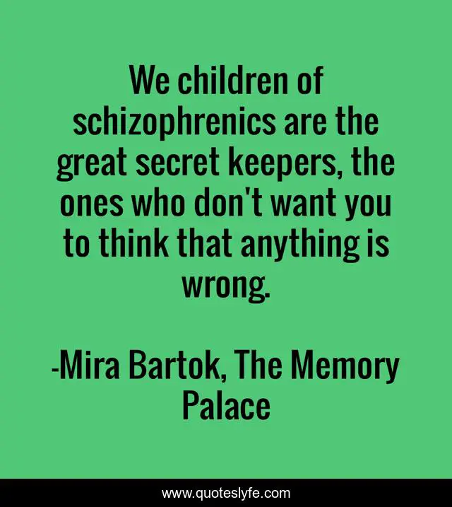 This page presents the quote "We children of schizophrenics are the great secret keepers, the ones who don't want you to think that anything is wrong.". Author of this quote is Mira Bartok, The Memory Palace. This quote is about secrets, schizophrenia,.