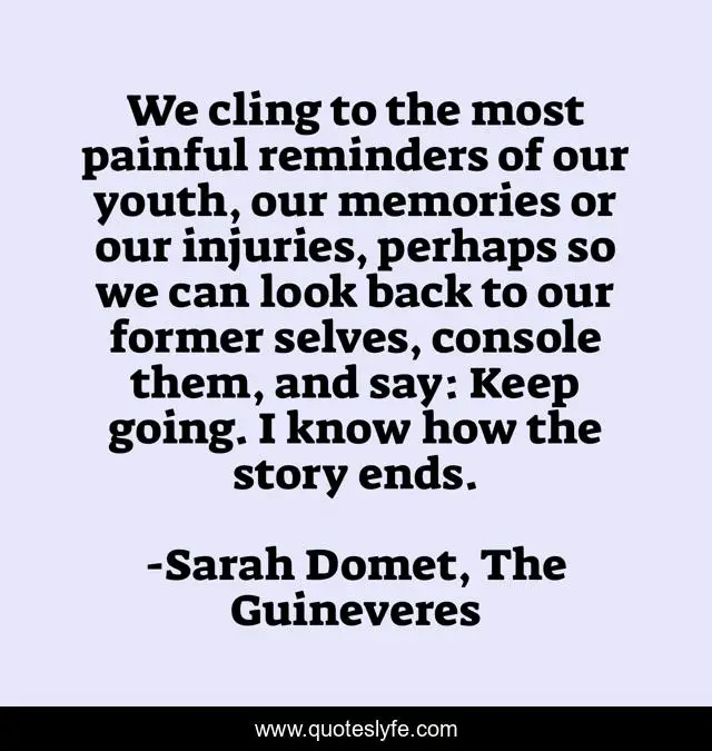 This page presents the quote "We cling to the most painful reminders of our youth, our memories or our injuries, perhaps so we can look back to our former selves, console them, and say: Keep going. I know how the story ends.". Author of this quote is Sarah Domet, The Guineveres. This quote is about remembrance, youth, nostalgia,.