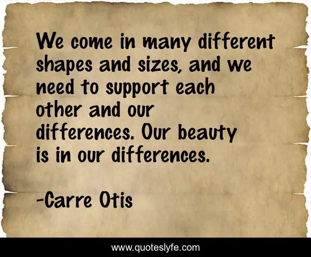 This page presents the quote "We come in many different shapes and sizes, and we need to support each other and our differences. Our beauty is in our differences.". Author of this quote is Carre Otis. This quote is about need, support, differences,.