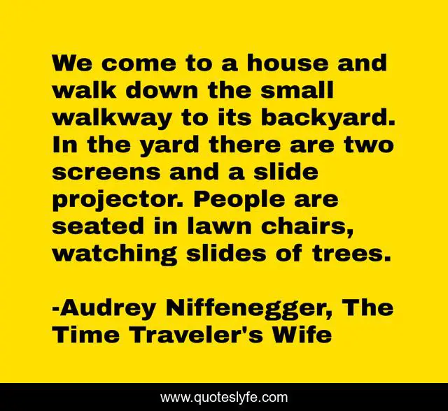 This page presents the quote "We come to a house and walk down the small walkway to its backyard. In the yard there are two screens and a slide projector. People are seated in lawn chairs, watching slides of trees.". Author of this quote is Audrey Niffenegger, The Time Traveler's Wife. .