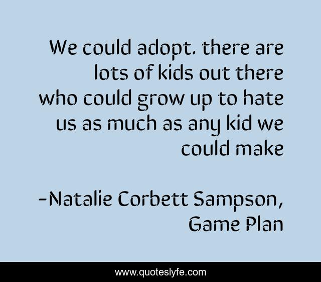 This page presents the quote "We could adopt. there are lots of kids out there who could grow up to hate us as much as any kid we could make". Author of this quote is Natalie Corbett Sampson, Game Plan. This quote is about ya, parenting, young-adult, adoption,.