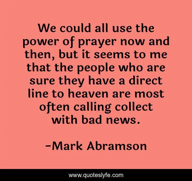 This page presents the quote "We could all use the power of prayer now and then, but it seems to me that the people who are sure they have a direct line to heaven are most often calling collect with bad news.". Author of this quote is Mark Abramson. This quote is about religion, humour, prayer,.