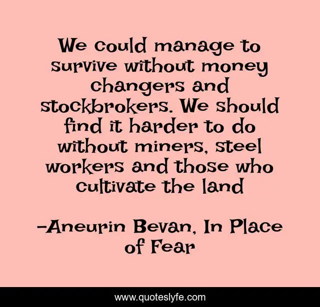 This page presents the quote "We could manage to survive without money changers and stockbrokers. We should find it harder to do without miners, steel workers and those who cultivate the land". Author of this quote is Aneurin Bevan, In Place of Fear. This quote is about economics, socialism,.