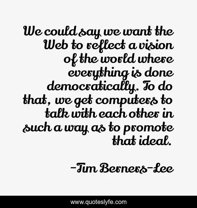 This page presents the quote "We could say we want the Web to reflect a vision of the world where everything is done democratically. To do that, we get computers to talk with each other in such a way as to promote that ideal.". Author of this quote is Tim Berners-Lee. This quote is about world, vision,.