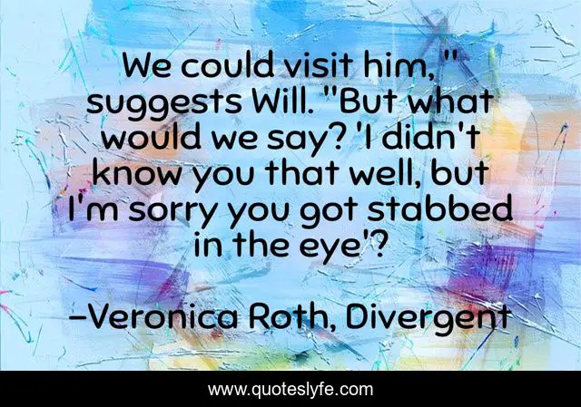 This page presents the quote "We could visit him, " suggests Will. "But what would we say? 'I didn't know you that well, but I'm sorry you got stabbed in the eye'?". Author of this quote is Veronica Roth, Divergent. This quote is about humor, consolation,.