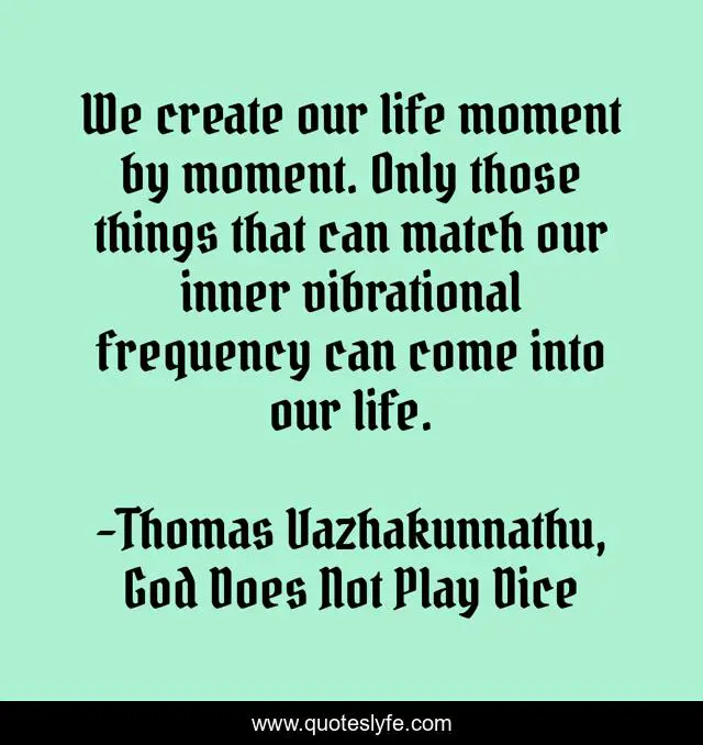 This page presents the quote "We create our life moment by moment. Only those things that can match our inner vibrational frequency can come into our life.". Author of this quote is Thomas Vazhakunnathu, God Does Not Play Dice. This quote is about philosophy, self-development,.