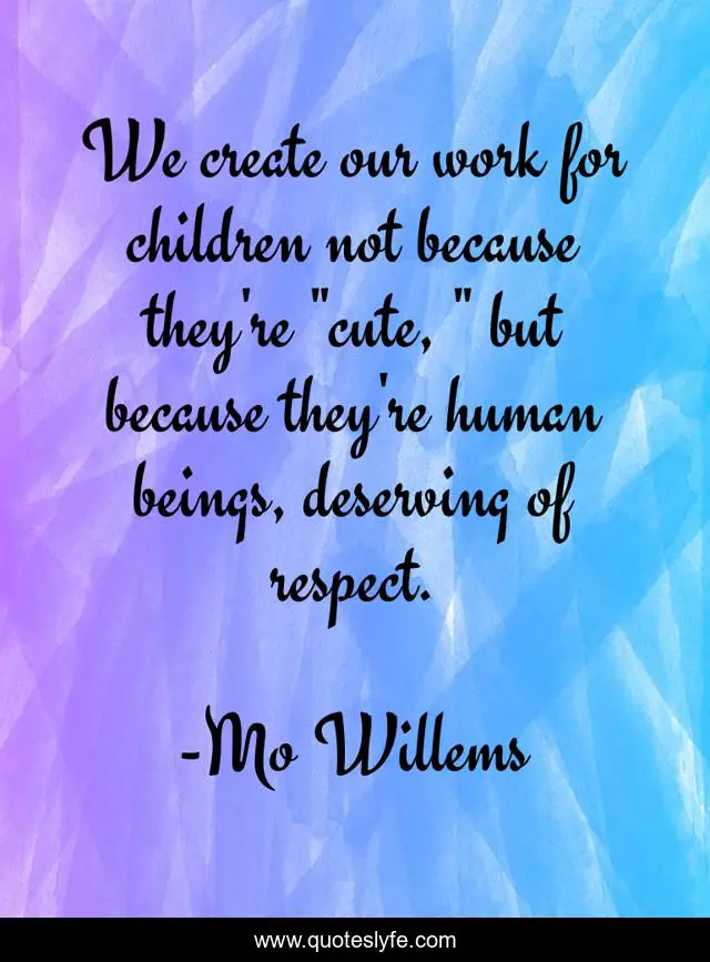 This page presents the quote "We create our work for children not because they're "cute, " but because they're human beings, deserving of respect.". Author of this quote is Mo Willems. This quote is about childrens-literature, children-s-literature, children-s-books, childrens-rights, children, respect, childrens-lit, picture-books,.