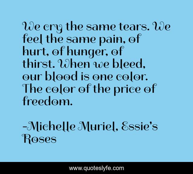 This page presents the quote "We cry the same tears. We feel the same pain, of hurt, of hunger, of thirst. When we bleed, our blood is one color. The color of the price of freedom.". Author of this quote is Michelle Muriel, Essie's Roses. This quote is about freedom, unity, equality, inspire,.