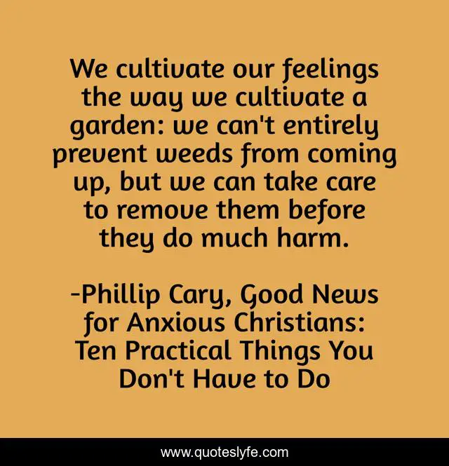 This page presents the quote "We cultivate our feelings the way we cultivate a garden: we can't entirely prevent weeds from coming up, but we can take care to remove them before they do much harm.". Author of this quote is Phillip Cary, Good News for Anxious Christians: Ten Practical Things You Don't Have to Do. This quote is about discipline, virtue, feelings,.