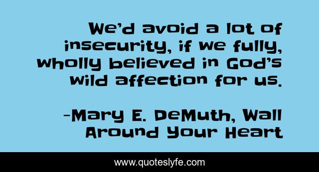 This page presents the quote "We’d avoid a lot of insecurity, if we fully, wholly believed in God’s wild affection for us.". Author of this quote is Mary E. DeMuth, Wall Around Your Heart. This quote is about love, god, religion, insecurity, believe, affection,.