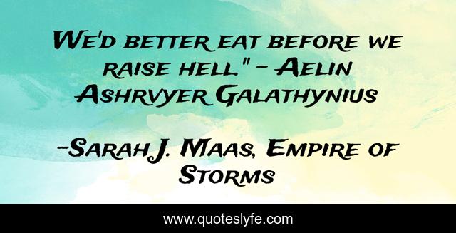 This page presents the quote "We'd better eat before we raise hell." - Aelin Ashrvyer Galathynius". Author of this quote is Sarah J. Maas, Empire of Storms. This quote is about aelin-ashryver-galathynius, eat, sarah-j-maas, food, empire-of-storms, tog, eos, throne-of-glass, hell,.