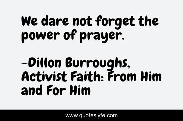 This page presents the quote "We dare not forget the power of prayer.". Author of this quote is Dillon Burroughs, Activist Faith: From Him and For Him. .
