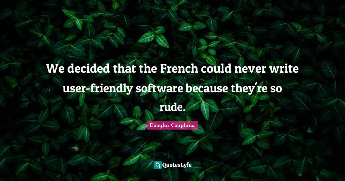 This page presents the quote "We decided that the French could never write user-friendly software because they're so rude.". Author of this quote is Douglas Coupland. This quote is about writing, software, rude, decided, friendly,.
