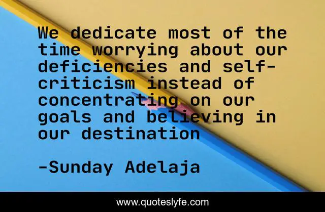 This page presents the quote "We dedicate most of the time worrying about our deficiencies and self-criticism instead of concentrating on our goals and believing in our destination". Author of this quote is Sunday Adelaja. This quote is about life, goal, destination, dedicate, self-criticism, mission, deficiencies, purpose, time,.