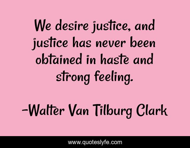 This page presents the quote "We desire justice, and justice has never been obtained in haste and strong feeling.". Author of this quote is Walter Van Tilburg Clark. .