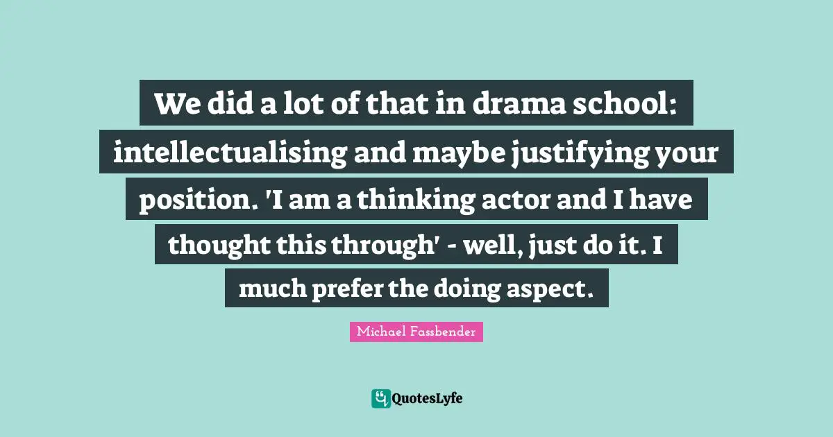 This page presents the quote "We did a lot of that in drama school: intellectualising and maybe justifying your position. 'I am a thinking actor and I have thought this through' - well, just do it. I much prefer the doing aspect.". Author of this quote is Michael Fassbender. This quote is about drama, position, school, just do it, thinking, aspect,.