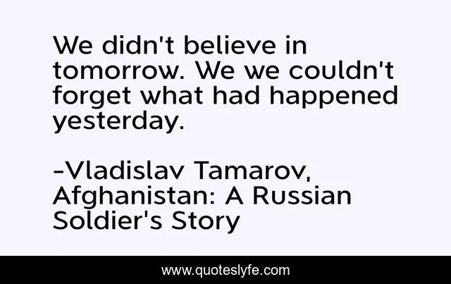 This page presents the quote "We didn’t believe in tomorrow. We we couldn’t forget what had happened yesterday.". Author of this quote is Vladislav Tamarov, Afghanistan: A Russian Soldier's Story. This quote is about hopelessness, war, memory,.