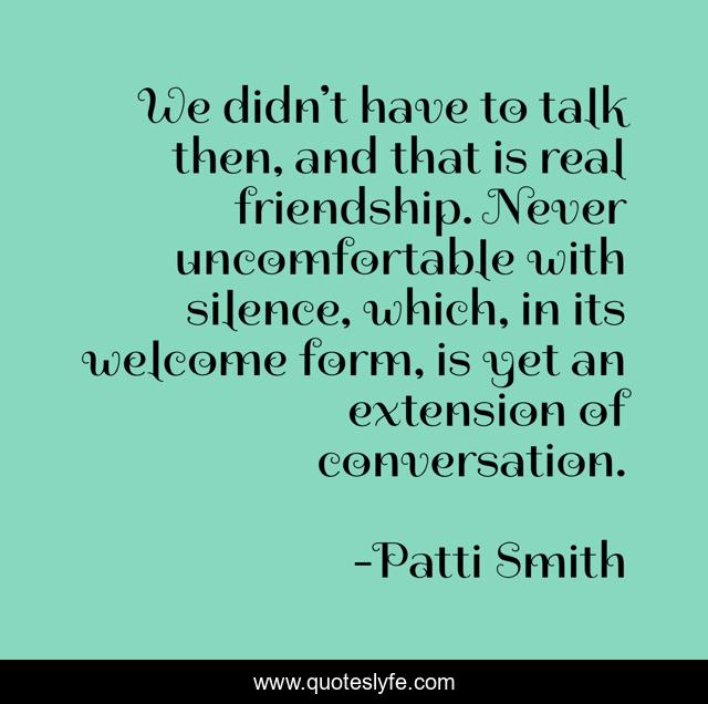 This page presents the quote "We didn’t have to talk then, and that is real friendship. Never uncomfortable with silence, which, in its welcome form, is yet an extension of conversation.". Author of this quote is Patti Smith. This quote is about friendship, sam-shepard, new-yorker,.