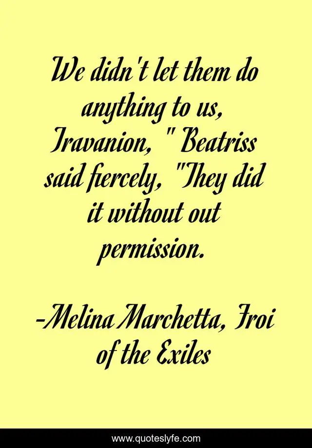 This page presents the quote "We didn't let them do anything to us, Travanion, " Beatriss said fiercely, "They did it without out permission.". Author of this quote is Melina Marchetta, Froi of the Exiles. .