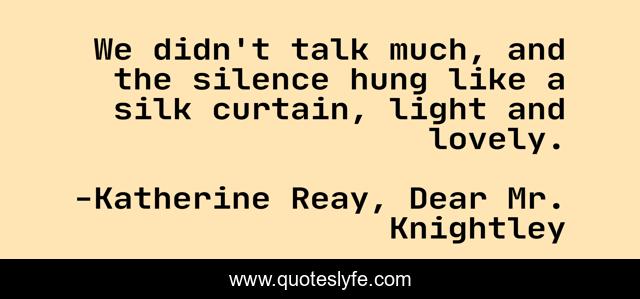 This page presents the quote "We didn't talk much, and the silence hung like a silk curtain, light and lovely.". Author of this quote is Katherine Reay, Dear Mr. Knightley. This quote is about imagery, silence,.