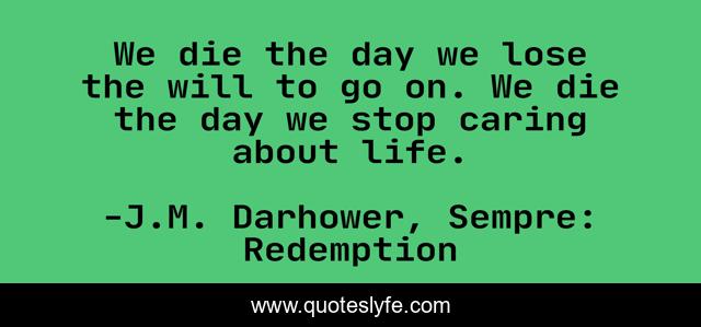 This page presents the quote "We die the day we lose the will to go on. We die the day we stop caring about life.". Author of this quote is J.M. Darhower, Sempre: Redemption. This quote is about die, life-changing, lose,.