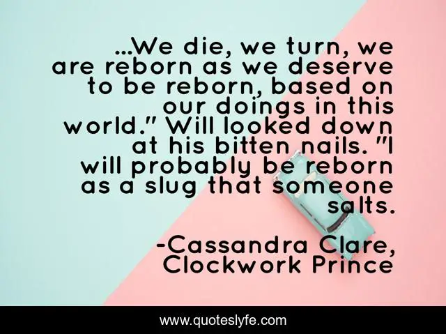 This page presents the quote "...We die, we turn, we are reborn as we deserve to be reborn, based on our doings in this world." Will looked down at his bitten nails. "I will probably be reborn as a slug that someone salts.". Author of this quote is Cassandra Clare, Clockwork Prince. This quote is about reborn, afterlife,.