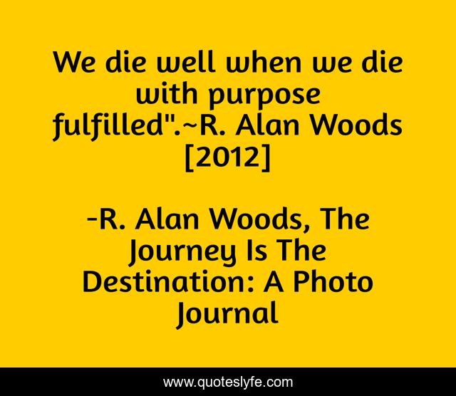 This page presents the quote "We die well when we die with purpose fulfilled".~R. Alan Woods [2012]". Author of this quote is R. Alan Woods, The Journey Is The Destination: A Photo Journal. This quote is about purpose-in-life, r-alan-woods, death-and-dying, fulfilling-purpose,.