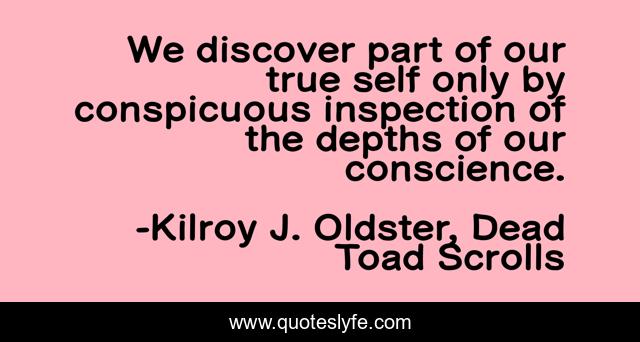 This page presents the quote "We discover part of our true self only by conspicuous inspection of the depths of our conscience.". Author of this quote is Kilroy J. Oldster, Dead Toad Scrolls. This quote is about self-awareness, self-knowledge, self-discovery, self, self-investigation, self-knowing, self-questioning, authentic-self,.