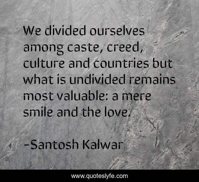 This page presents the quote "We divided ourselves among caste, creed, culture and countries but what is undivided remains most valuable: a mere smile and the love.". Author of this quote is Santosh Kalwar. This quote is about division, love, affection, smile, happiness, caste,.