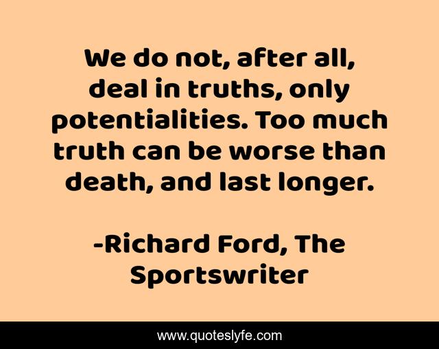 This page presents the quote "We do not, after all, deal in truths, only potentialities. Too much truth can be worse than death, and last longer.". Author of this quote is Richard Ford, The Sportswriter. This quote is about death, potentialities, potential, truth,.