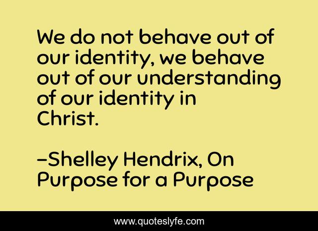 This page presents the quote "We do not behave out of our identity, we behave out of our understanding of our identity in Christ.". Author of this quote is Shelley Hendrix, On Purpose for a Purpose. This quote is about esther, identity-in-christ, purpose, inspirational, enthusiasm, identity,.