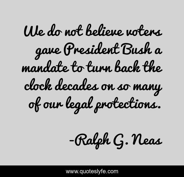 This page presents the quote "We do not believe voters gave President Bush a mandate to turn back the clock decades on so many of our legal protections.". Author of this quote is Ralph G. Neas. This quote is about president, believe, clock,.