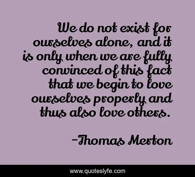 This page presents the quote "We do not exist for ourselves alone, and it is only when we are fully convinced of this fact that we begin to love ourselves properly and thus also love others.". Author of this quote is Thomas Merton. This quote is about love, exist, fact, affection,.