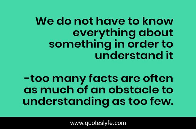 "too many facts are often as much of an obstacle to understanding as too few. Quotes." Quoteslyfe.com, 2025. Fri. 05 Dec. 2025. <https://www.quoteslyfe.com/quote/We-do-not-have-to-know-everything-156878>.