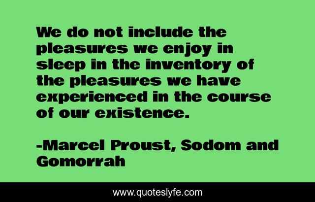 This page presents the quote "We do not include the pleasures we enjoy in sleep in the inventory of the pleasures we have experienced in the course of our existence.". Author of this quote is Marcel Proust, Sodom and Gomorrah. This quote is about pleasure, pleasures-of-life, sleep,.