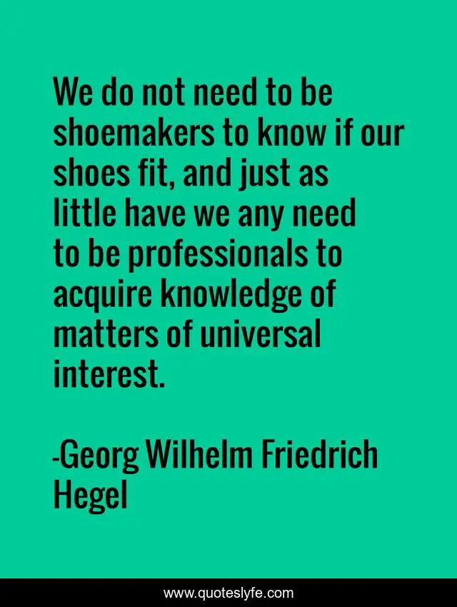 This page presents the quote "We do not need to be shoemakers to know if our shoes fit, and just as little have we any need to be professionals to acquire knowledge of matters of universal interest.". Author of this quote is Georg Wilhelm Friedrich Hegel. This quote is about matters, shoes,.
