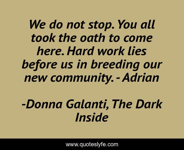 This page presents the quote "We do not stop. You all took the oath to come here. Hard work lies before us in breeding our new community. - Adrian". Author of this quote is Donna Galanti, The Dark Inside. This quote is about alien, cult, science-fiction,.