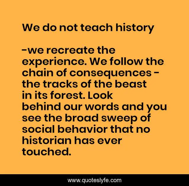 "we recreate the experience. We follow the chain of consequences - the tracks of the beast in its forest. Look behind our words and you see the broad sweep of social behavior that no historian has ever touched. Quotes." Quoteslyfe.com, 2025. Fri. 05 Dec. 2025. <https://www.quoteslyfe.com/quote/We-do-not-teach-history-70438>.