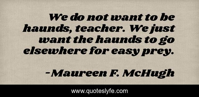This page presents the quote "We do not want to be haunds, teacher. We just want the haunds to go elsewhere for easy prey.". Author of this quote is Maureen F. McHugh. .
